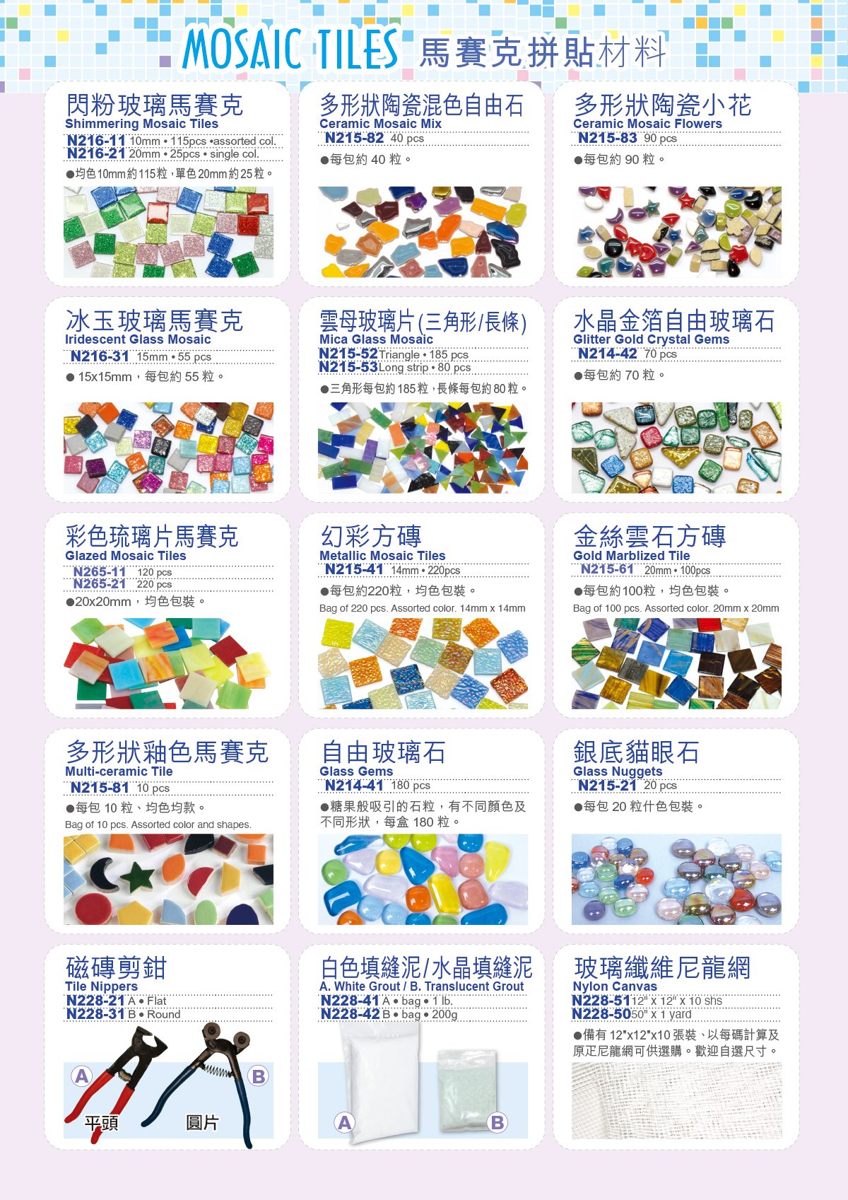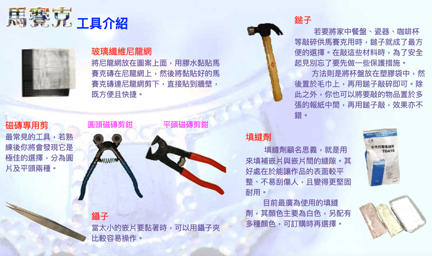 色彩繽紛的馬賽克磚能拼出不同配搭的圖形,製作成獨一無二的馬賽克手作精品。